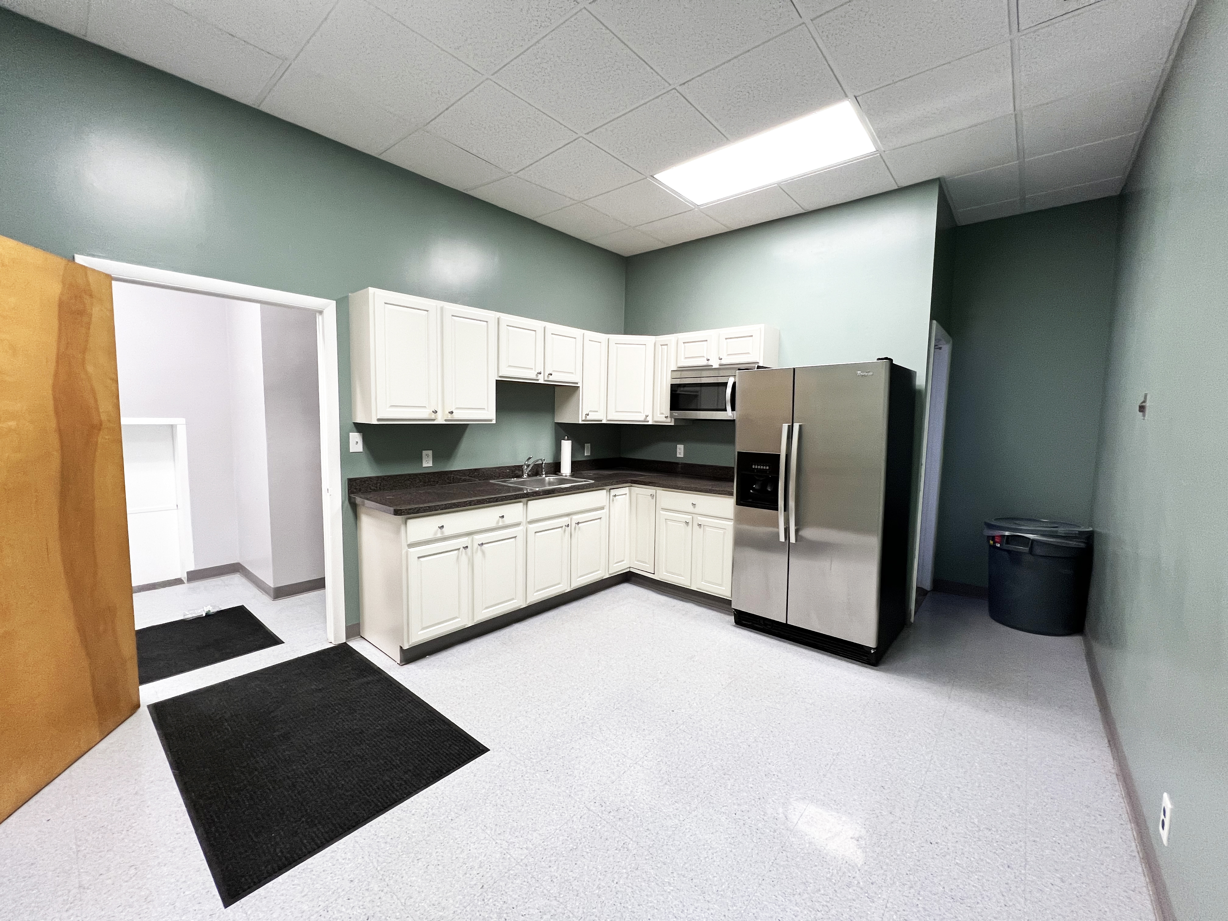 We also have upstairs offices available. The space is divided into several small offices, with restrooms and a kitchen.